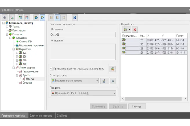 Хранение данных по выработке, ИГЭ, линии разрезов, данных о водоносных горизонтах, а также общих сведений