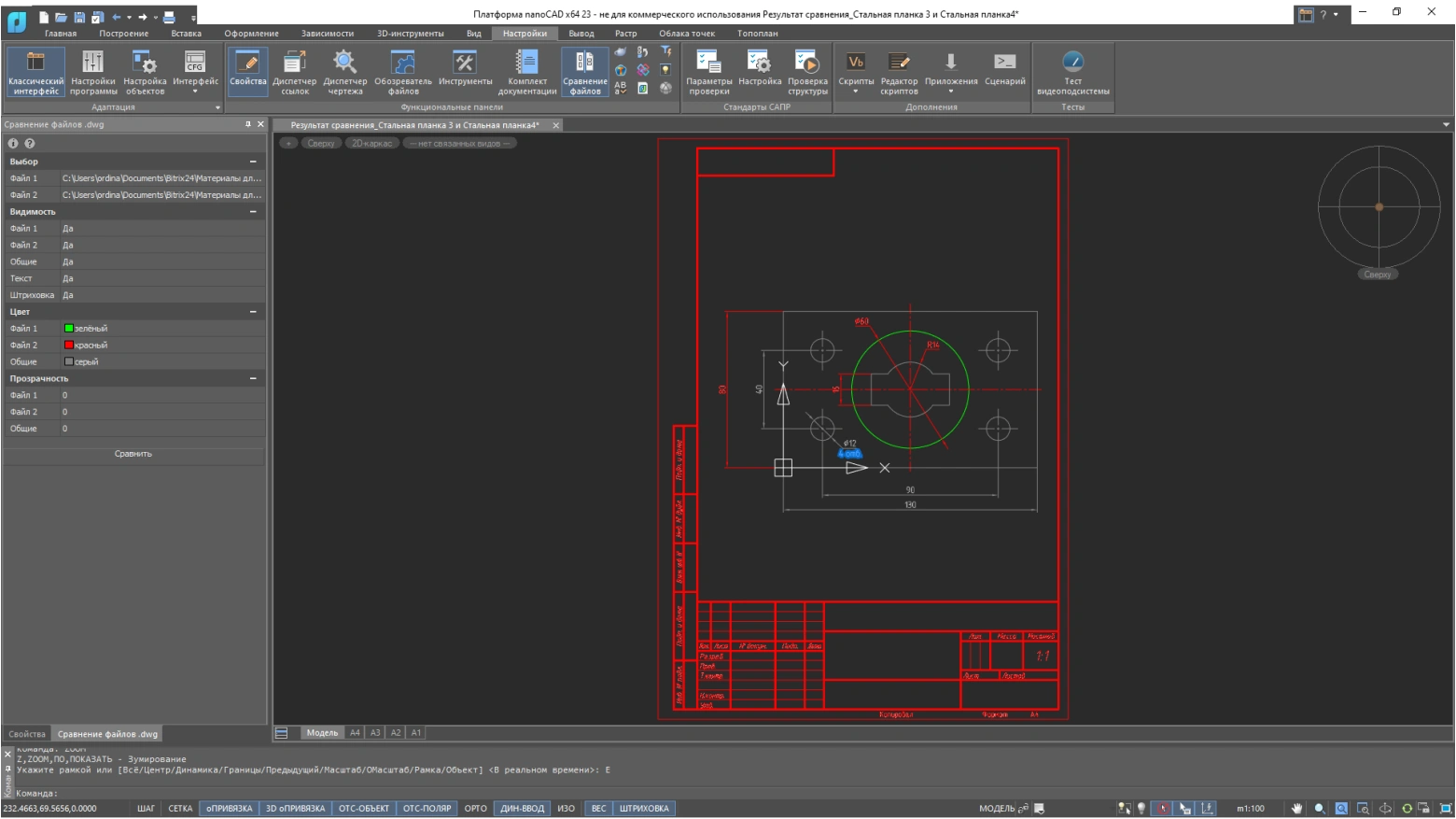 Платформа nanoCAD позволяет находить различия между двумя похожими чертежами в пространстве модели. При сравнении обнаруживаются объекты, которые были изменены, добавлены или удалены